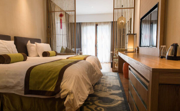 3、客房??头恐凶铌P(guān)頭的無疑是一張和緩舒適的大床了??头恐械乃械脑O(shè)計(jì)都要圍繞床來睜開。以床為核心設(shè)置設(shè)備放置床頭燈和簡略的桌椅。一個(gè)開閉柔柔空間夠大的衣柜可以放置參觀者的全數(shù)行李,也能儉仆室內(nèi)空間。